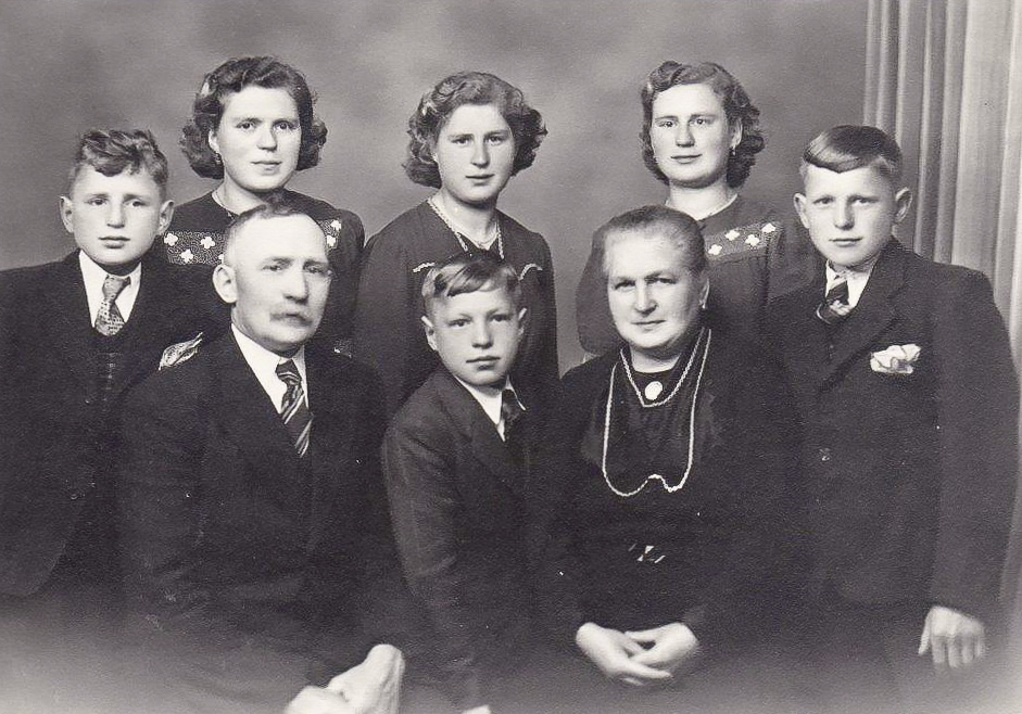 Foto van de familie Karel Van den Keybus - Joanna Anthonissen. Vooraan op de foto links: Karel Van den Keybus (°21/10/1892) en rechts Joanna Anthonissen (°16/04/1895) In het midden: Fons Van den Keybus (°24/03/1932) gehuwd met Lisa Schrauwen. Achteraan links: Louis Van den Keybus (°18/9/30) gehuwd met Lucie Oostvogels. Dan Marie Van den Keybus (°22/04/1923) gehuwd met Mathijs Van Hoydonck. Louisa Van den Keybus (°22/05/1928) gehuwd met Adriaan Jochems. Joanna Van den Keybus (°15/05/1924) gehuwd met Emiel Bevers. Jos Van den Keybus (°02/07/1929) gehuwd met Anna Kenis.