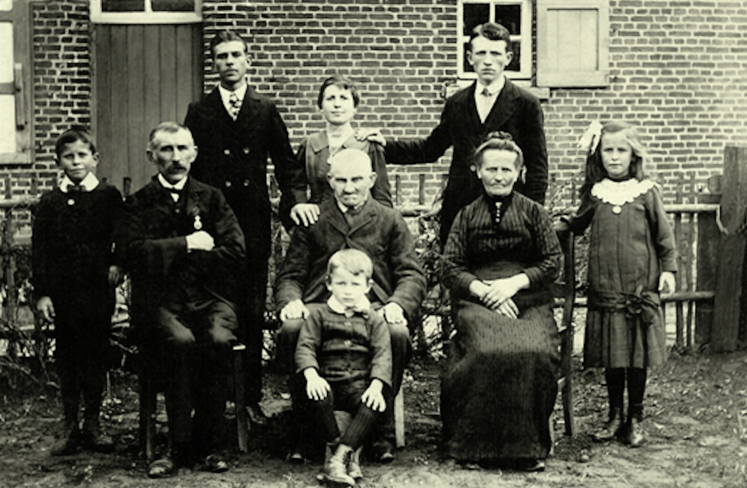 Familie Van der Jonckheyd Bovenaan van links naar rechts: Louis, Netje en Stan Midden: Fons, vader Keeske, grootvader Peer van Rikskens, moeder Lieneke Tegenbos en Julia. Vooraan Sooi