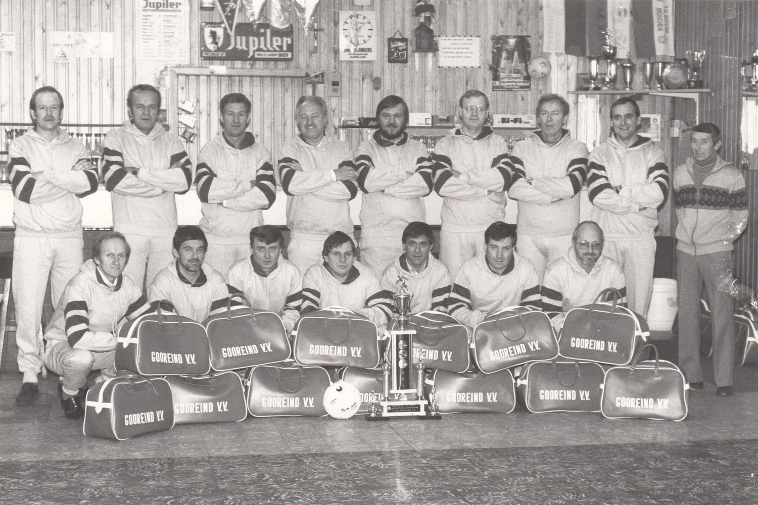in de kantine aan het sigarenfabriek. Bovenste rij: Paul Wouters, Jerom Janssens, Bert Kerstens, Piet Heerkens, Fred Maes, Leo Van Campen, Roland Adam, Fons Dictus, Wim Wagemakers. Onderste rij: Frans Wagemakers, Dré Mattheeussen, Christ Van Hal, John Vergouwen, Leo Beyers, Swa Michielsen, Jos Frans.