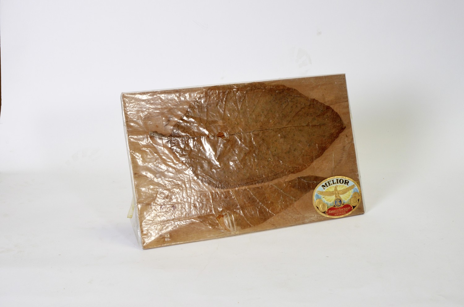 Depot Wesalia IIHouten plank met tabaksbladen - Melior Ernest Tinchant AnversDozen met grondstoffenGegevensFysieke locatie: Depot Wesalia IIUID: 012779Bestandsnaam: P:\Foto's\Erfgoedstukken\Depot Wesalia II\012779.jpg