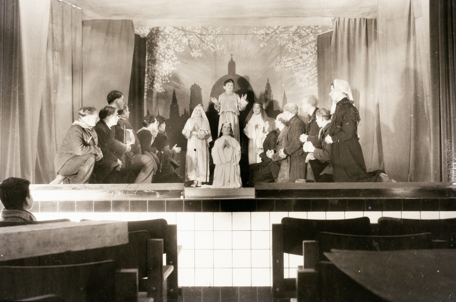 Opvoering van 'Waar de sterre bleef stille staan' in de parochiezaal van Wuustwezel in 1947.